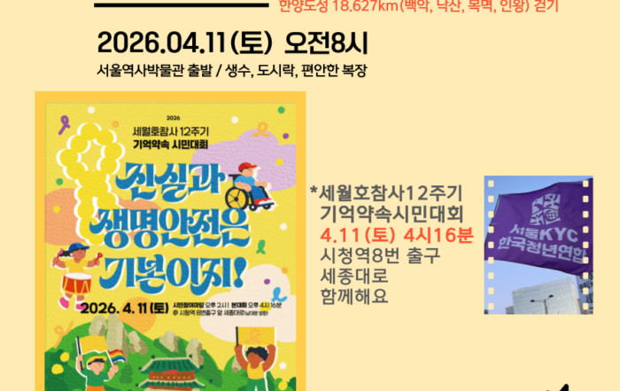 2026 세월호를 기억하는 서울KYC 기억행동 1. 서울KYC 기억순성 -2026년 4월 11일(토) 오전8시 -서울역사박물관 앞 출발 안전한 사회를 기원하는 마음을 담아 한양도성을 순성합니다. 각자 이루고 싶은 소원, 생명안전사회에 대한 염원, 더 나은 사회, 더 많은 민주주의를 [...]